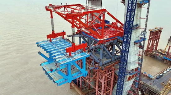 Publication Date:2025-06-09On June 8th, 2025, the 1100t deck derrick crane successfully finished the first steel segmeng lifting in Chong-Qi bridge of?Shanghai-Chongqing-Chengdu High-speed Railway.